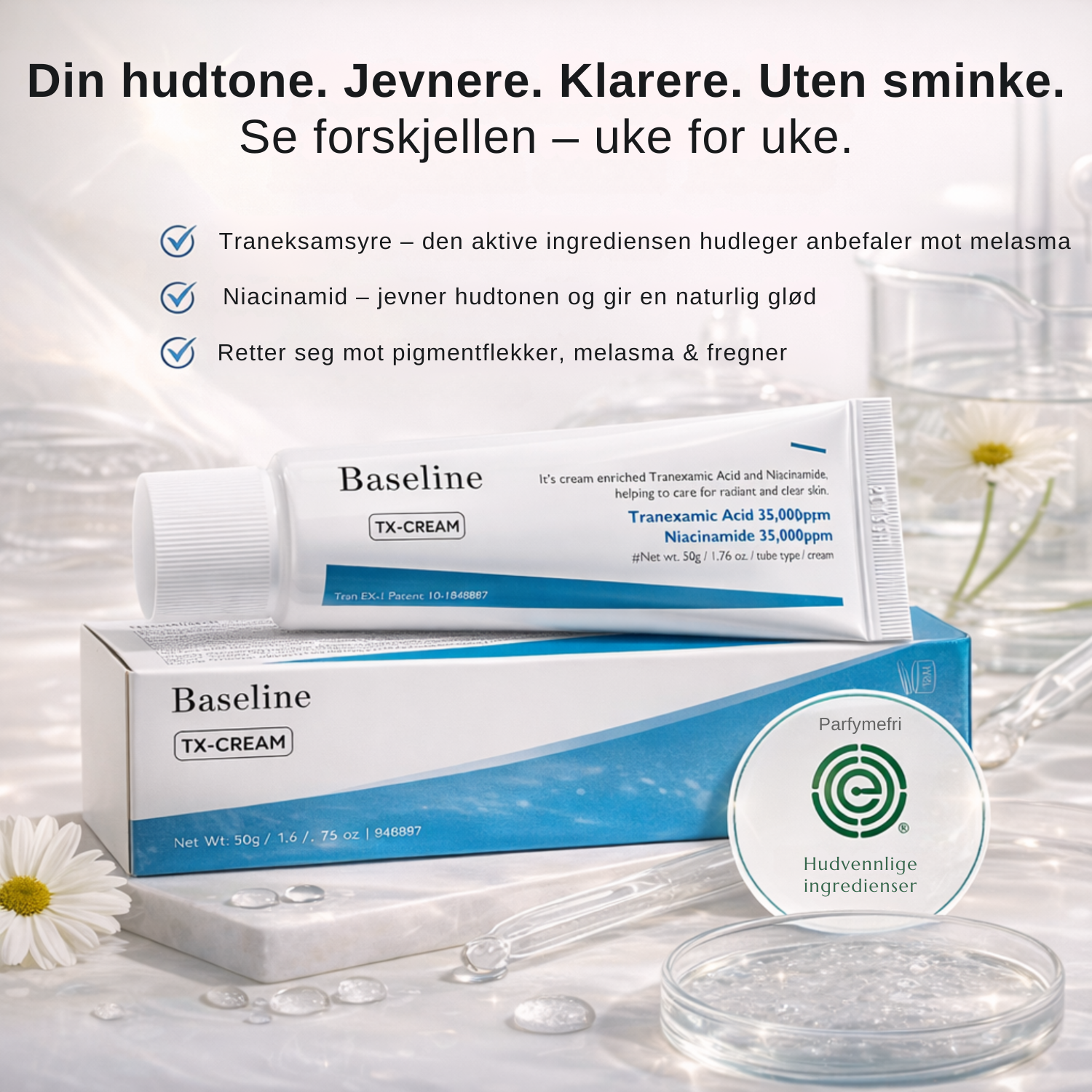 Det er et helt rimelig spørsmål. De fleste pigmentkremer inneholder én aktiv ingrediens i en for lav konsentrasjon. Baseline TX-Cream kombinerer tre ingredienser i høye konsentrasjoner som angriper pigmentet på forskjellige nivåer samtidig. Det er mekanismen som utgjør forskjellen – ikke markedsføringen.