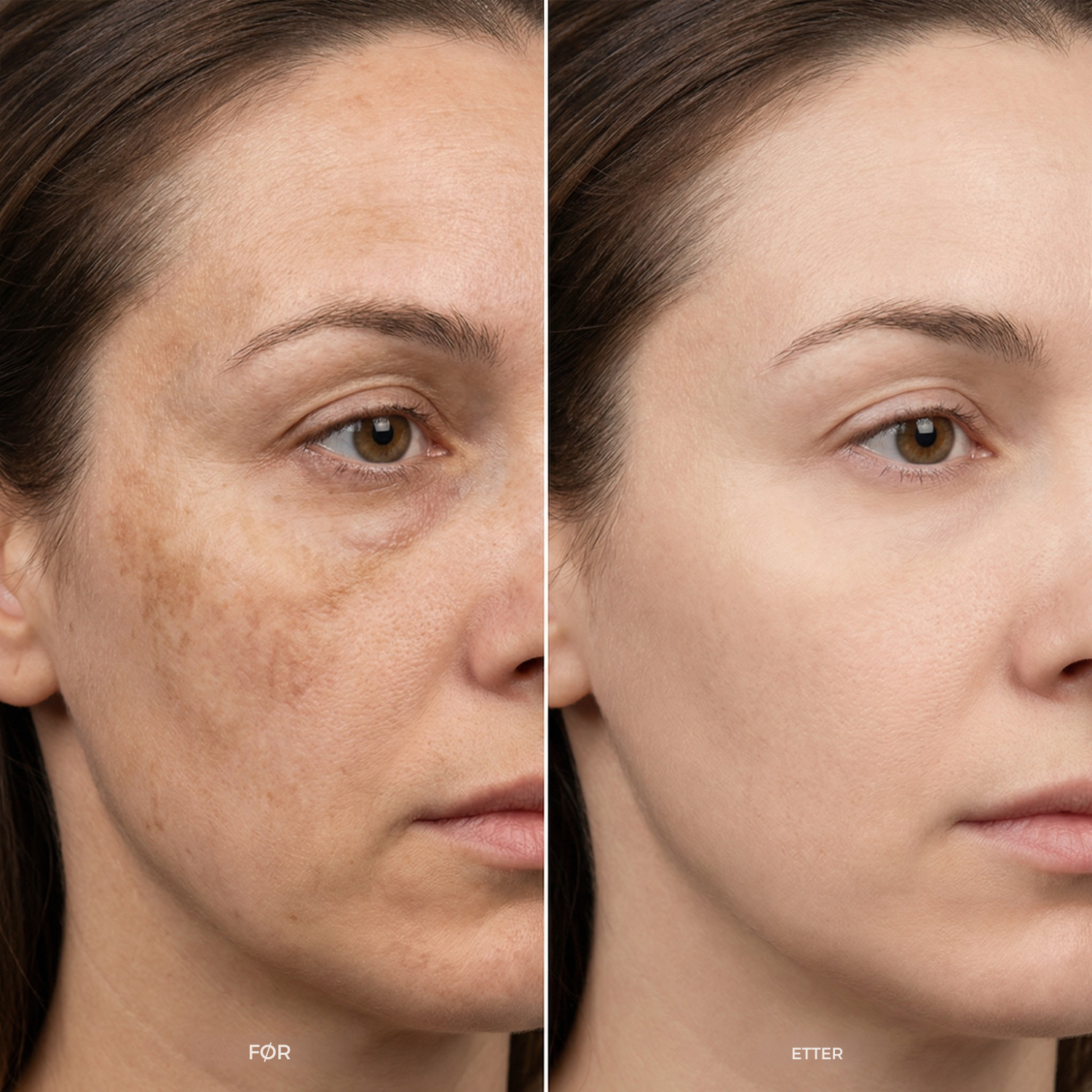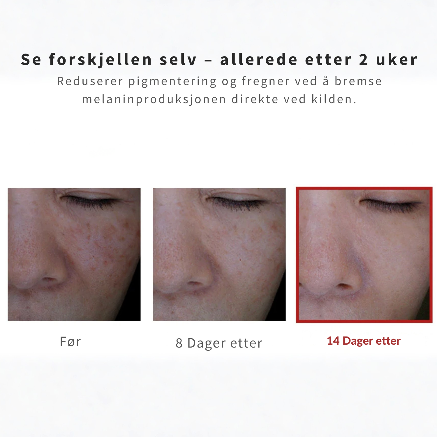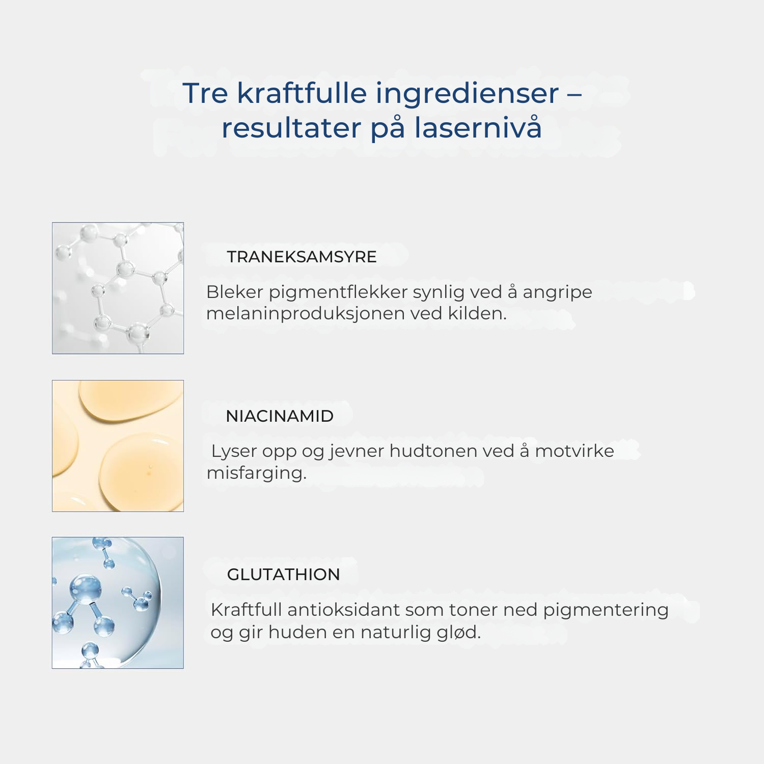 Tranexaminsyre bryter ned eksisterende flekker ved kilden. Niacinamid jevner ut hudtonen og forhindrer ny misfarging. Glutation beskytter huden og hindrer at pigmentet kommer tilbake.