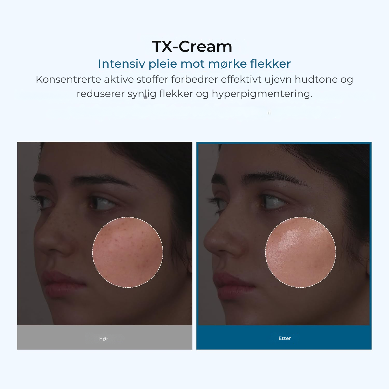 I stedet for én aktiv ingrediens kombinerer TX-Cream tre – i usedvanlig høye konsentrasjoner – som virker sammen mot pigment på flere nivåer samtidig: