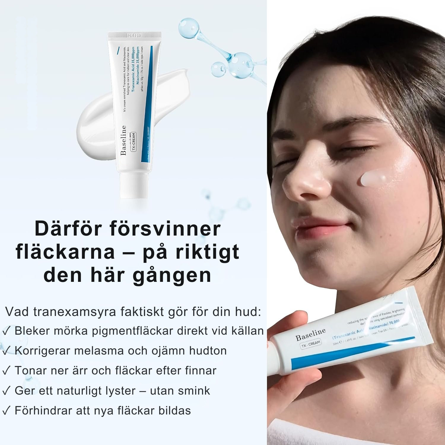 Ja. Tranexamsyra är en av få ingredienser med dokumenterad effekt mot melasma – det är därför hudläkare använder den. Kombinationen med niacinamid och glutathion förstärker effekten ytterligare.