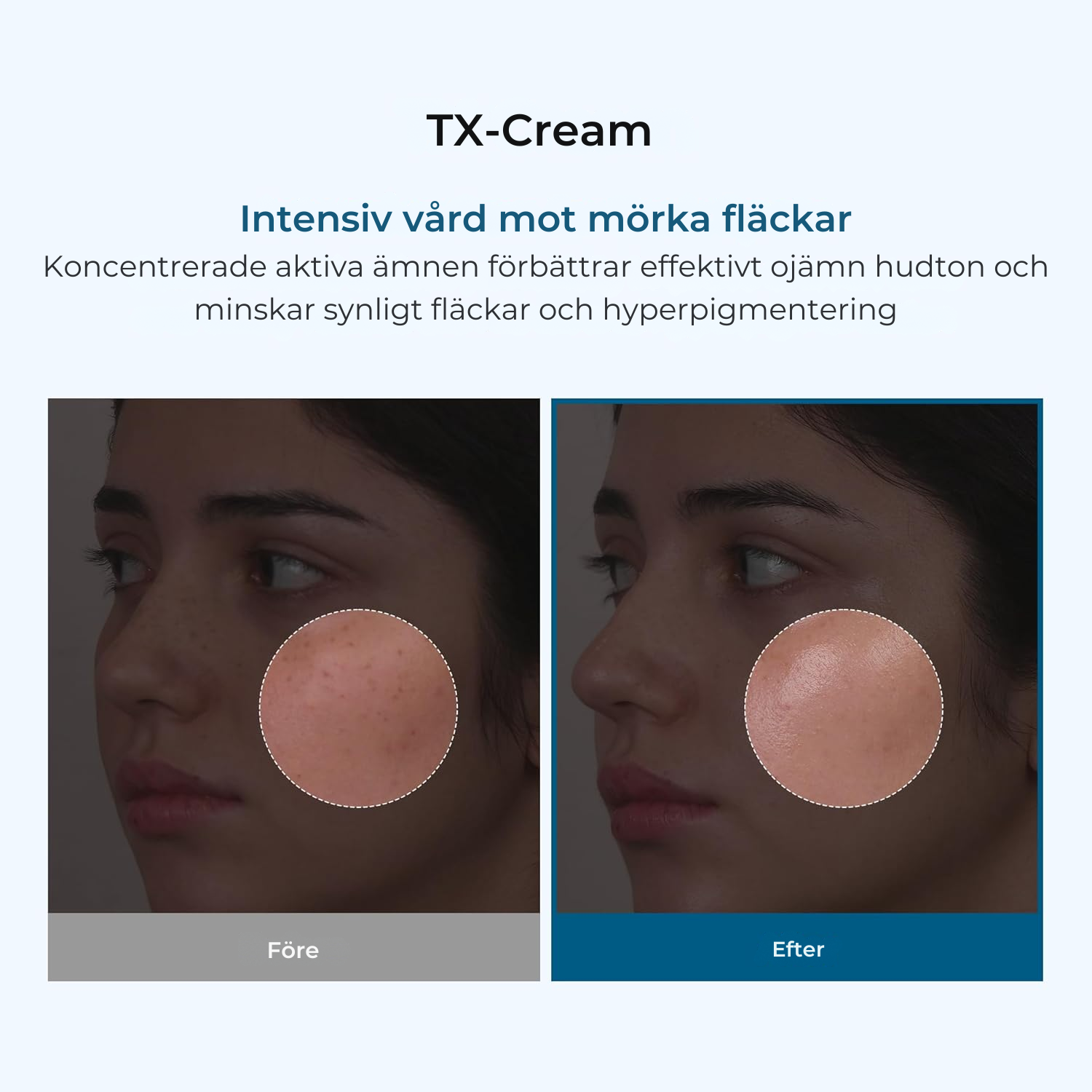 Istället för en enda aktiv ingrediens kombinerar TX-Cream tre – i exceptionellt höga koncentrationer – som arbetar tillsammans mot pigmentet på flera nivåer samtidigt: