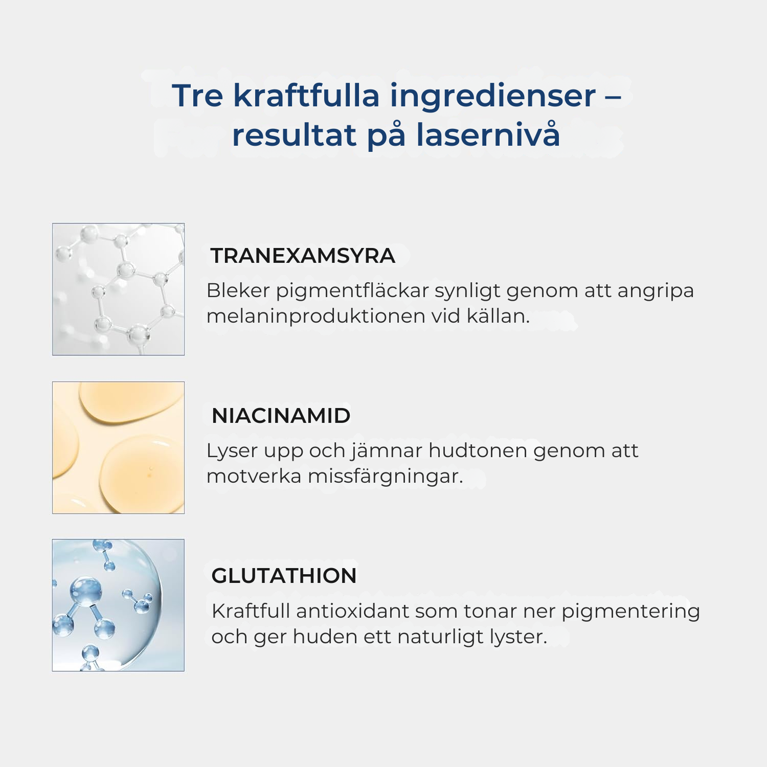 Tranexamsyra bryter ner befintliga fläckar vid källan. Niacinamid jämnar hudtonen och motverkar nya missfärgningar. Glutathion skyddar huden och förhindrar att pigmentet återkommer.